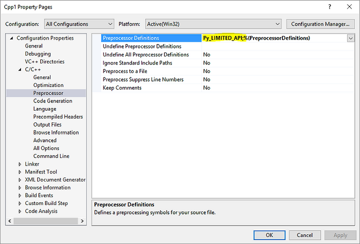 CPython only: add Py_LIMITED_API; to the beginning of the string (including the semicolon). This definition restricts some of the functions you can call from Python and makes the code more portable between different versions of Python. If you're working with PyBind11, don't add this definition, otherwise you'll see build errors.