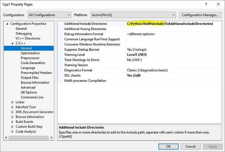 Working with C++ requires that you use a 32-bit Python interpreter (Python 3.6 or above recommended).